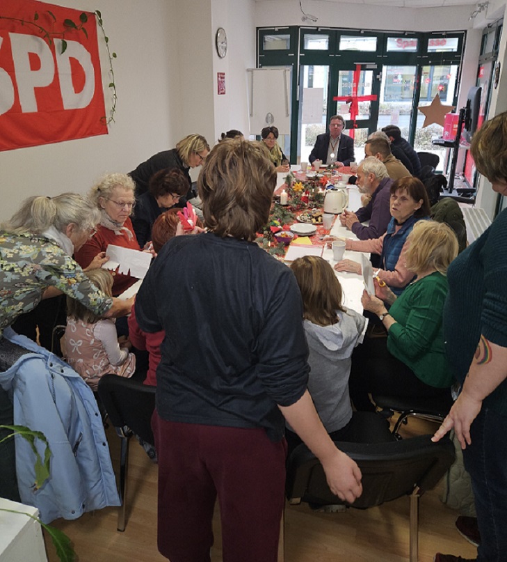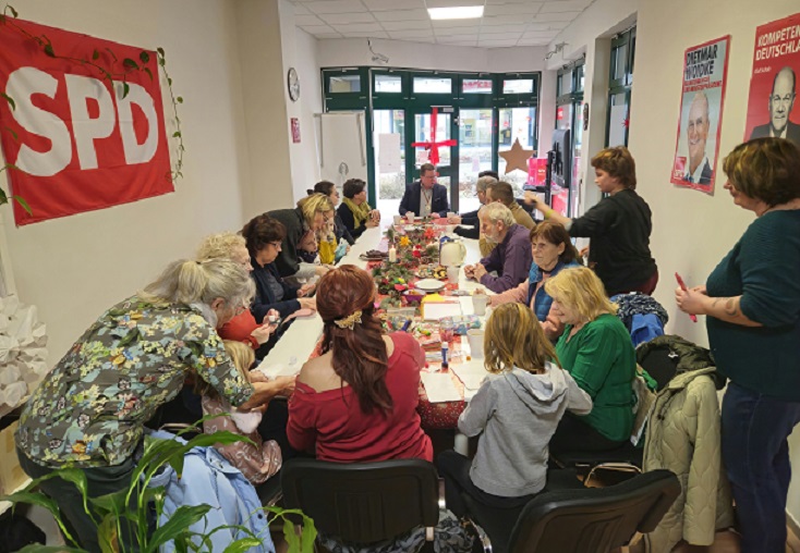 Der SPD-Ortsverein lud im Rahmen der 16. Kalendertürchen-Aktion der Stadt Forst (Lausitz) zu einem gemütlichen Nachmittag bei Stollen und Gebäck zum weihnachtlichen Basteln ein. Omas und Opas kamen mit ihren Enkeln wie auch Eltern mit ihren Kindern und ließen sich nicht lange bitten, kreativ zu werden. So entstanden, neben Engeln und Sternen, auch bunte Tannenbäumchen und kleine schöne Pfefferkuchenhäuschen. Und nur zu gern ließen sich die kleinen „Weichnachtswichtel“ bunt glitzernde Weihnachtsmotive auf Arme und Hände „tattowieren“.